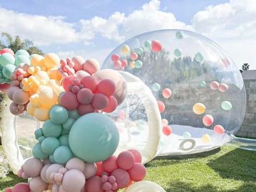 16'x13' inflatable bubble house with (100) latex interior balloons . Inflatable requires power source the entire duration of use. 100' extension cord included , Balloon garland is an additional fee starting at $360 for 12' Luxury Garland